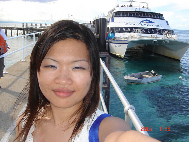 看到了吧!我身後那一艘船, 很安穩唷~~我可沒有吐哩! 還睡著,很平安地到達目的地~~